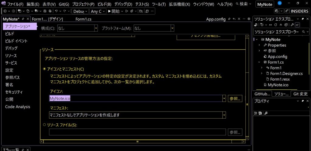 アイコンの登録はVisualStudioのメニューから下記の順番に従い進めて登録します。