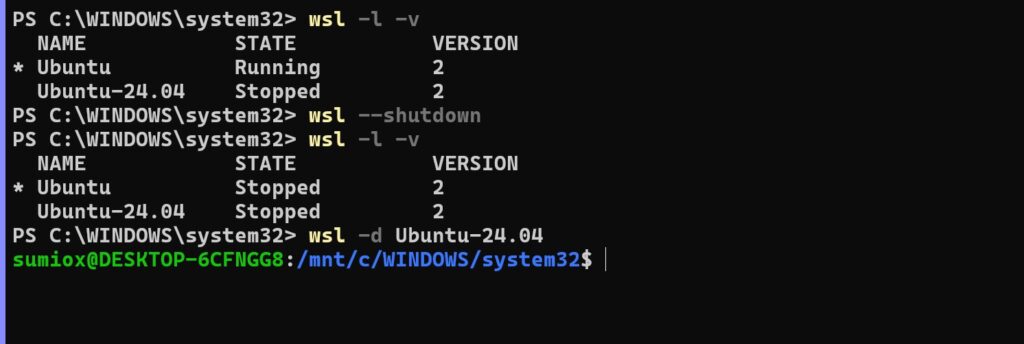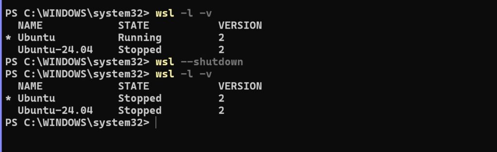 wsl --shutdown このコマンドでUbuntuが停止した。