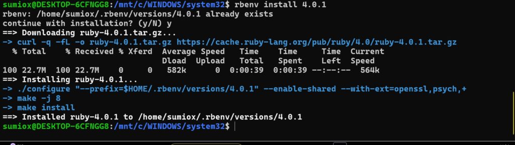 Ruby 4.0.1 が表示されているはずなので、下記コマンドを実行します。y/n を聞かれたら y を入力します。
